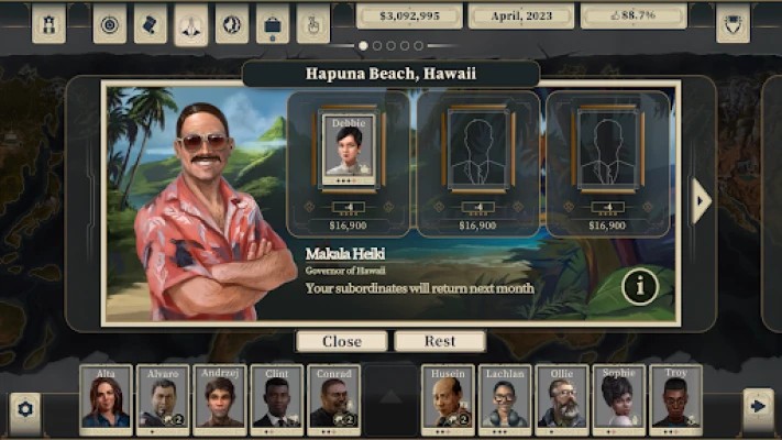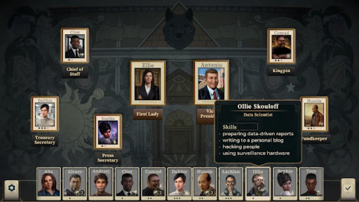 Vaša cesta k doživotnej imunite bude dláždená záludnými pascami a každodenným „upratovaním" nepríjemných prešľapov – takzvaných prezidentských povinností. Budete musieť obratne manažovať svoju popularitu, finančné zdroje a vernú posádku, aby ste si udržali absolútnu moc. Od organizovania prejavov, vydávania výkonných príkazov a riadenia denných kríz, až po majstrovské tlačové konferencie a strategické tweetovanie – každá akcia formuje váš odkaz. No nenechajte sa zmiasť: tie najšpinavšie úlohy si vyžadujú špecializovaný tím. Najmite si vrahov, hackerov, lobistov a ďalších expertov, ktorých vyšlete na nebezpečné misie. Najprv legálne, a keď to zlyhá, bez váhania ilegálne.