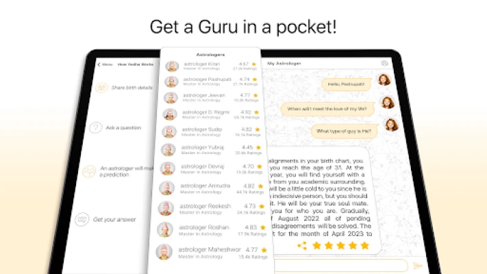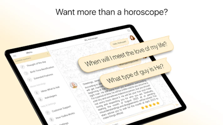 Za každou predpoveďou v aplikácii Yodha stojí skúsenosť a múdrosť tímu Yodha, tvoreného viac ako 300 certifikovanými védskymi astrológmi. Títo odborníci sú známi svojím hĺbavým prístupom a schopnosťou interpretovať nebeské vplyvy s mimoriadnou presnosťou, čím ti pomáhajú formovať tvoju realitu. Okrem individuálnych konzultácií nájdeš v Yodha aj inšpiratívne „Myšlienky dňa", ktoré rozžiaria tvoje rána a dodajú ti pozitívnu energiu. Tiež máš prístup k pravidelne aktualizovaným bezplatným horoskopom, ktoré ťa udržia v súlade s kozmickými prúdmi.